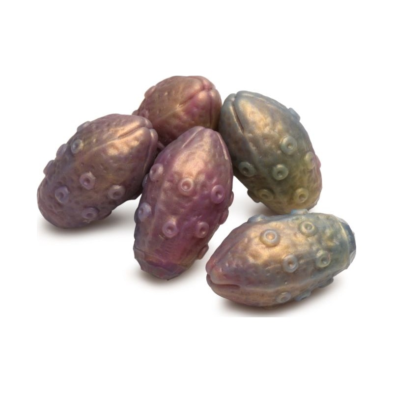 It's time to get bred by alien visitors. This thick, textured shaft from Creature Cocks is one of the most colorful yet with a mix of rich, vibrant, iridescent colors with shades of pink, green, orange and purple. The shaft itself is large and thick with tiny bumps on the head, ribbed texture along the opposite side, and a mixture of textures along the rod down to the wide, suction cup base. It can be used hands-free with the assistance of the suction cup or combined with a compatible harness for penetrating strapon play or pegging! Insert any or all of the four larva eggs into the hollow sheath and then insert them into your hole, letting the ovipositor deposit those eggs to be birthed out of you later after you're full! Made out of flexible, super soft, premium silicone both the dildo and the eggs are phthalate-free, body-safe, and best used with water-based lubricants only. To clean after, use warm water and mild soap then spray with a toy cleaner before patting dry
