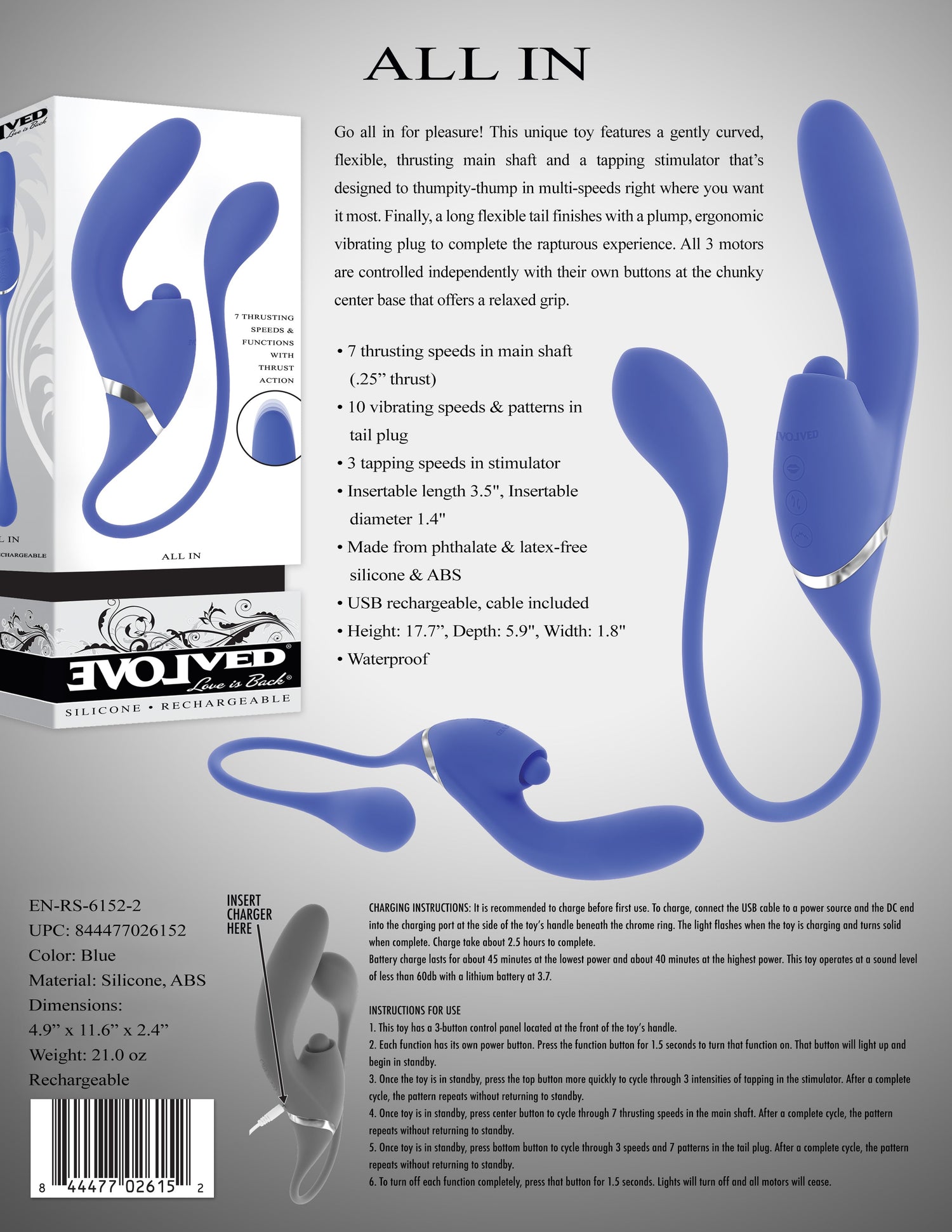 Get ready to dive into a world of unparalleled pleasure with the Evolved ALL IN - Purple USB Rechargeable Triple Stimulating Vibrator. Designed to thrill and satisfy every sense, this vibrator is a must-have for those who seek a comprehensive pleasure experience.