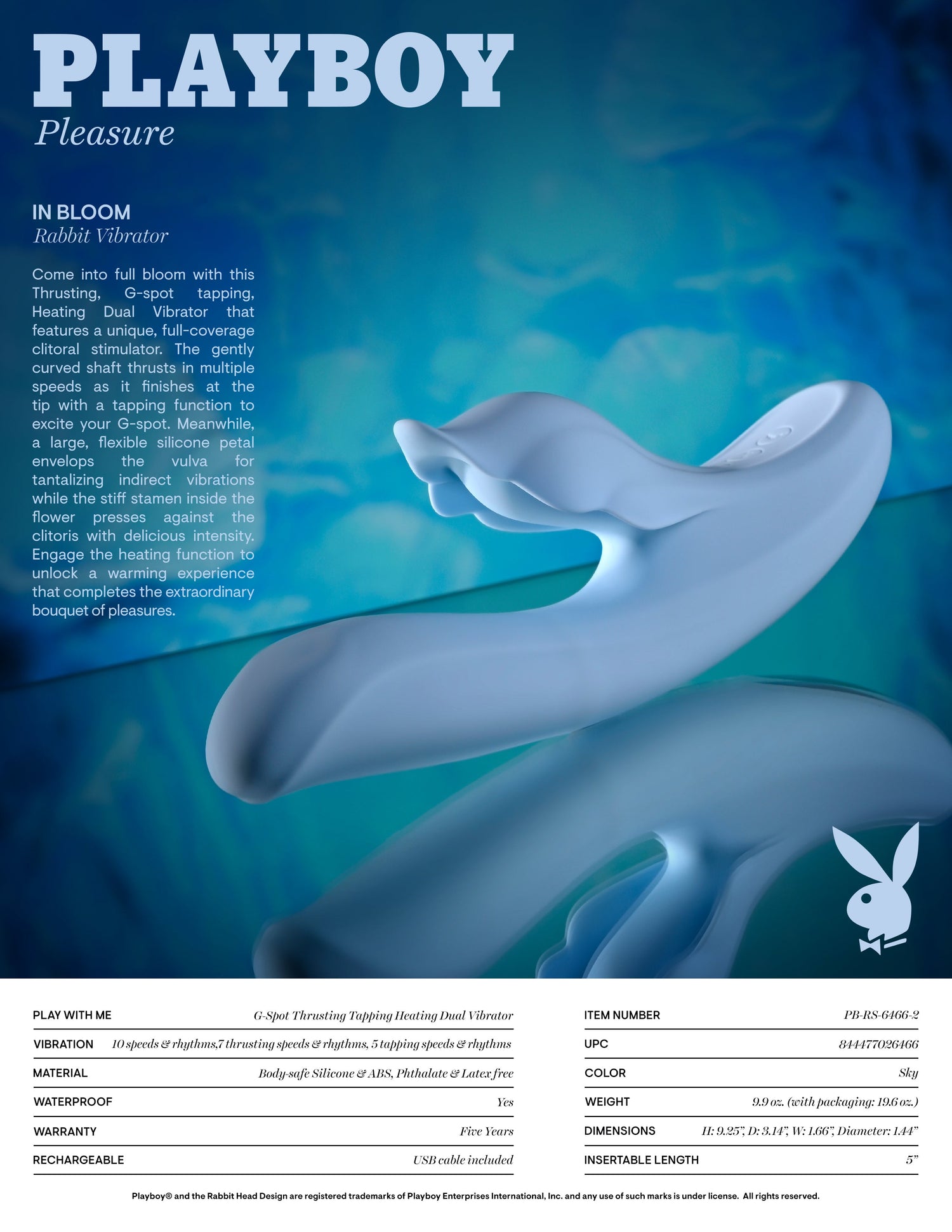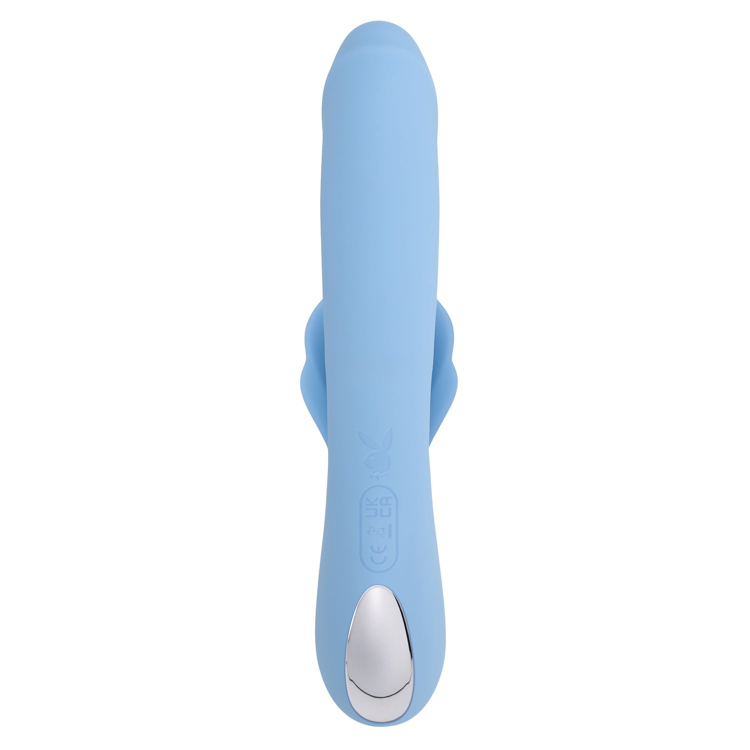 Introducing the Playboy Pleasure IN BLOOM - Blue, a USB rechargeable thrusting, tapping, and heating dual vibrator that transforms intimate time into a thrilling, indulgent experience.