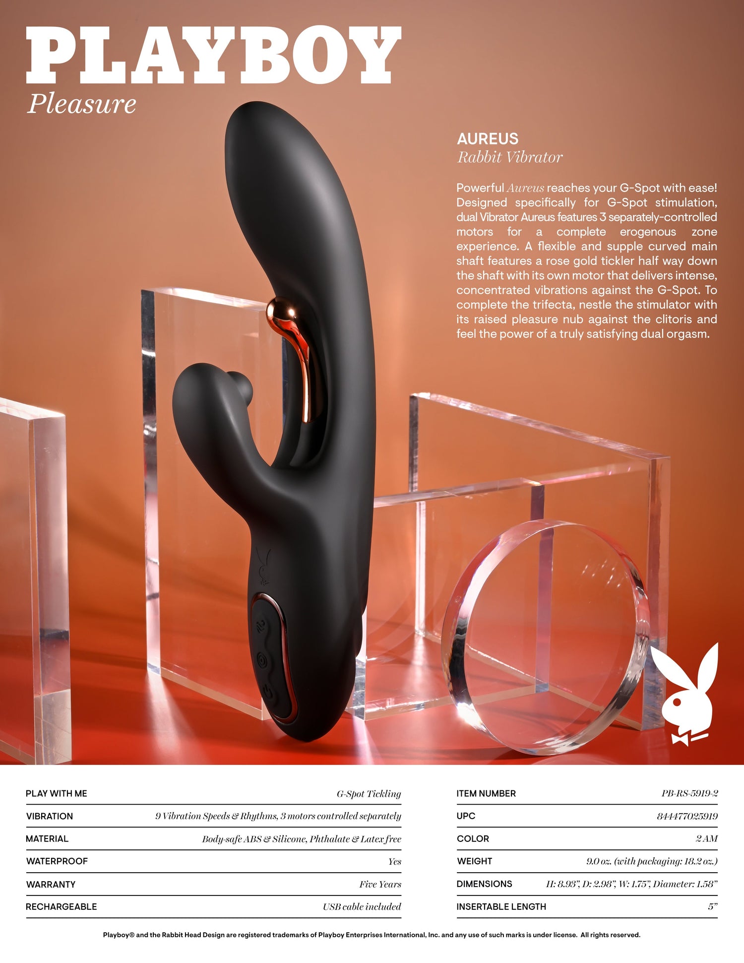 The Playboy Pleasure AUREUS is your gateway to an unforgettable experience. This innovative rabbit vibrator features a curved main shaft designed to target the G-spot effortlessly with precise vibrations. A distinct rose gold tickler, positioned strategically halfway down the shaft, enhances your stimulation with its independent motor.