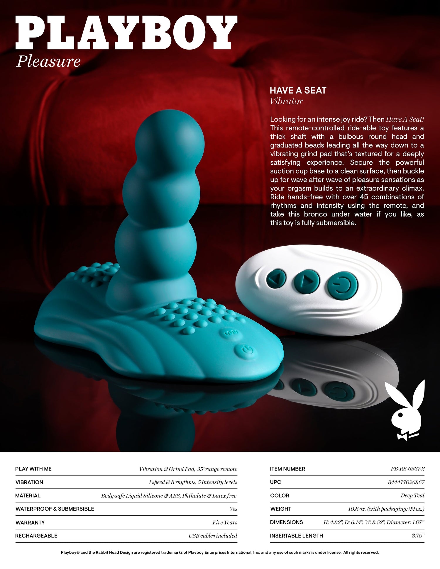 Embrace a new era of climax with the Playboy Pleasure HAVE A SEAT. Elevate your erotic experience and drive your senses wild, all while enjoying the peace of mind that comes from a brand that stands behind its exquisite craftsmanship.