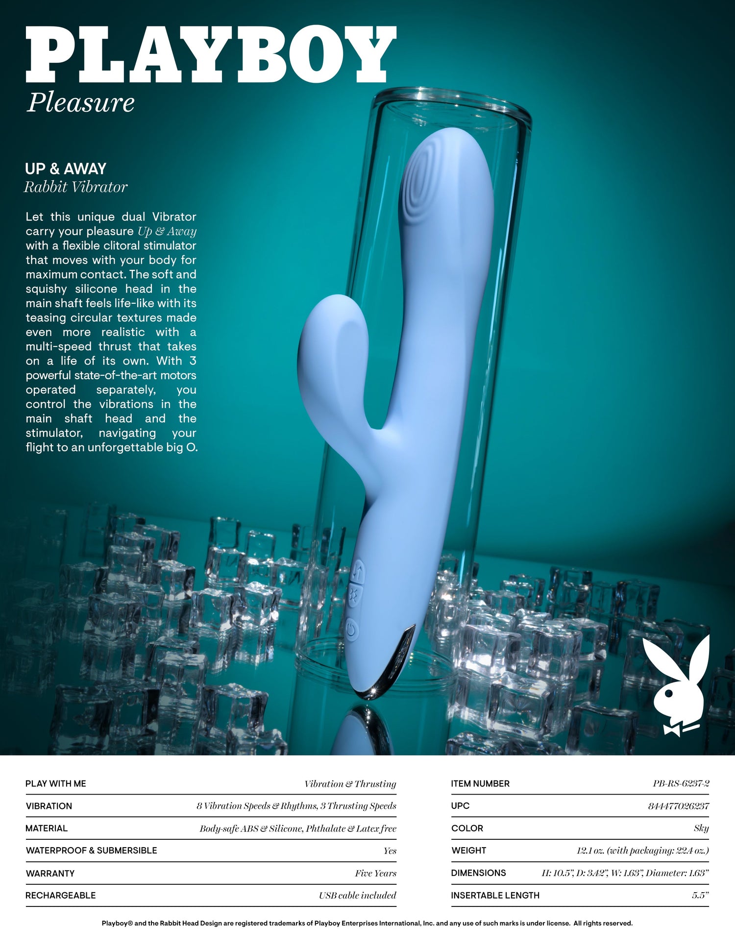 Designed to elevate your pleasure experiences, the Playboy Pleasure UP AND AWAY Blue Rabbit Vibrator offers unique dual-stimulation through its specialized features, crafting the perfect balance between internal and external satisfaction.