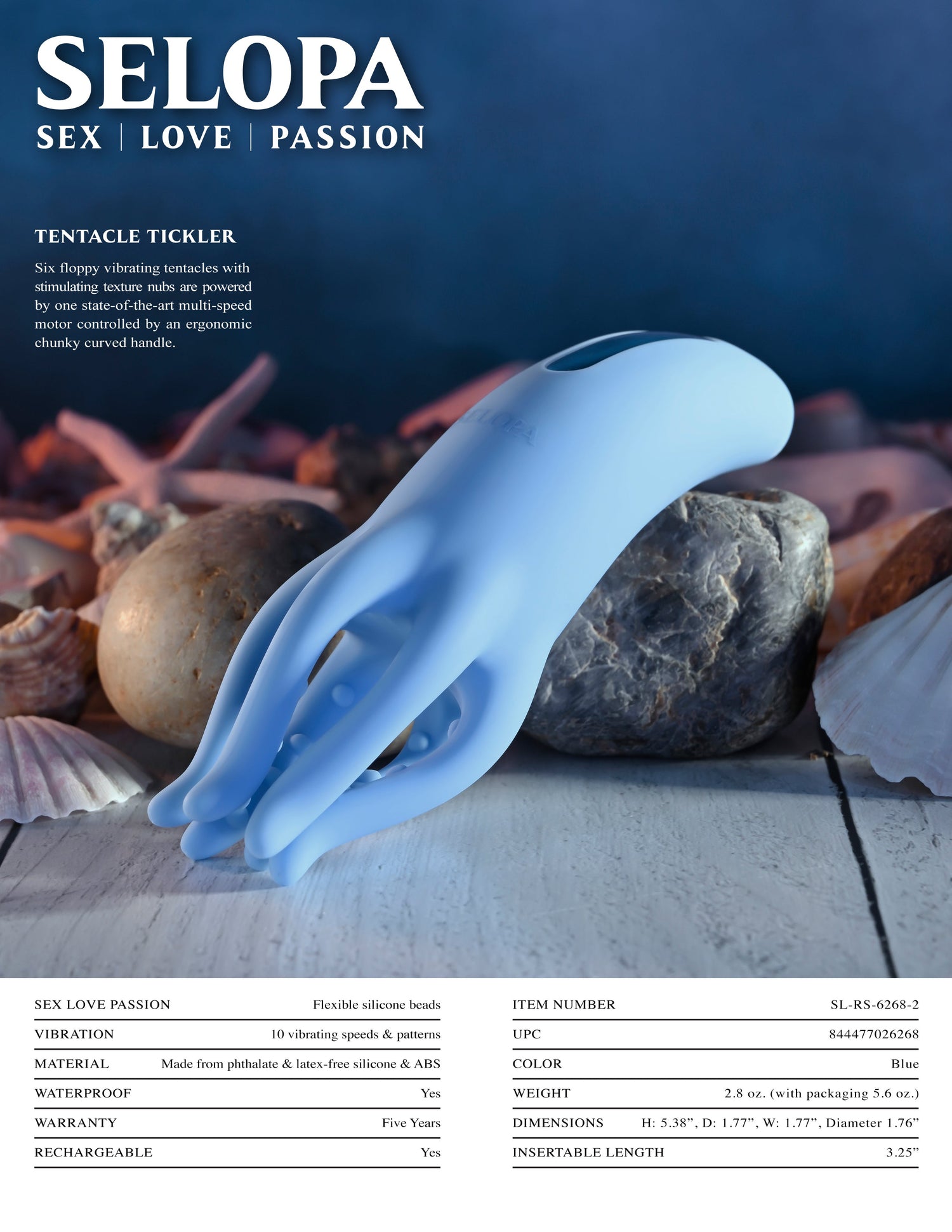 The Selopa TENTACLE TICKLER features a meticulously engineered design with six vibrating tentacles adorned with stimulating textured nubs. The ergonomic handle fits perfectly in your hand, making it easy to control and navigate through a variety of indulgent sensations.