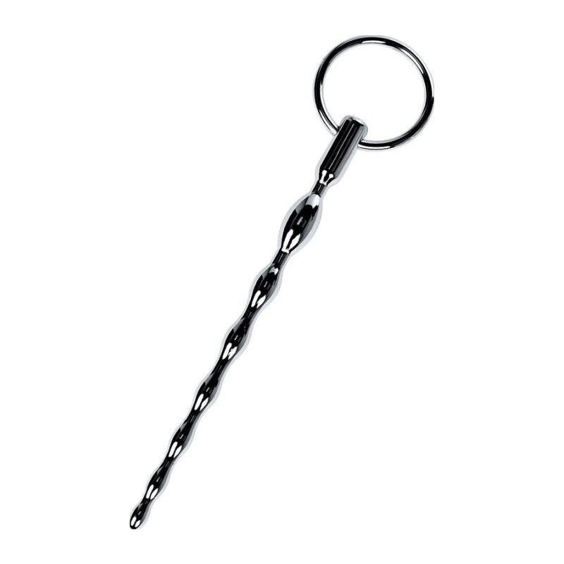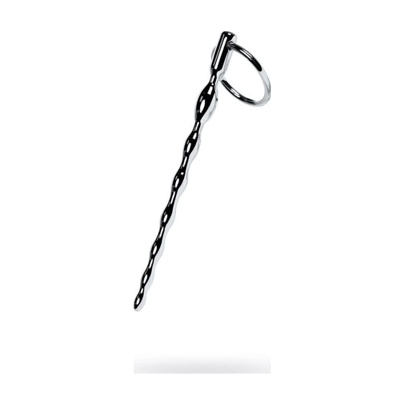 Silver metal urethral plug is in the shape of a pigtail. The changing diameter of the links will provide excellent stimulation of the urethra and includes two replaceable rings which are 25 mm and 30 mm in diameter.
