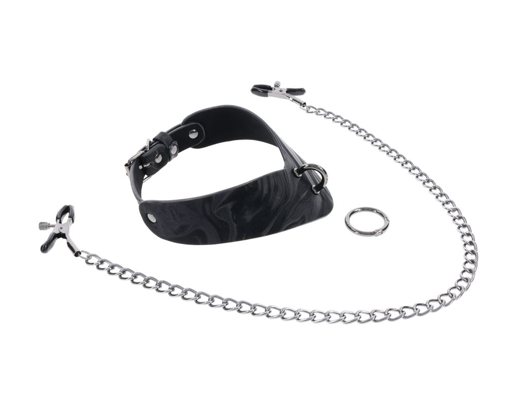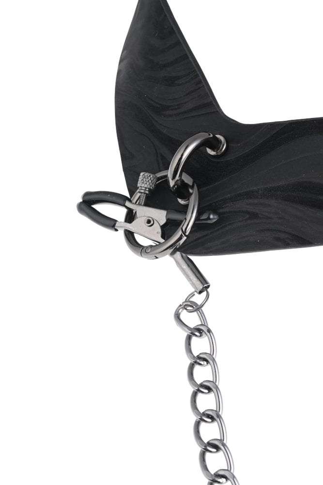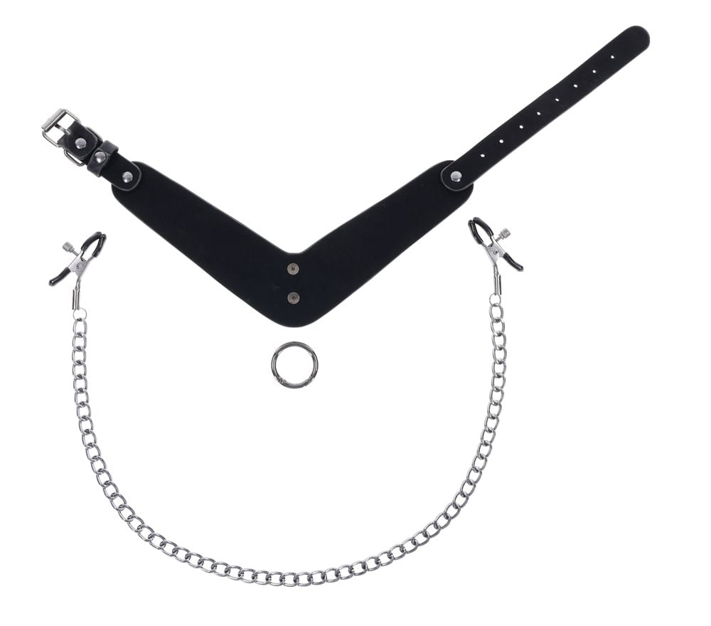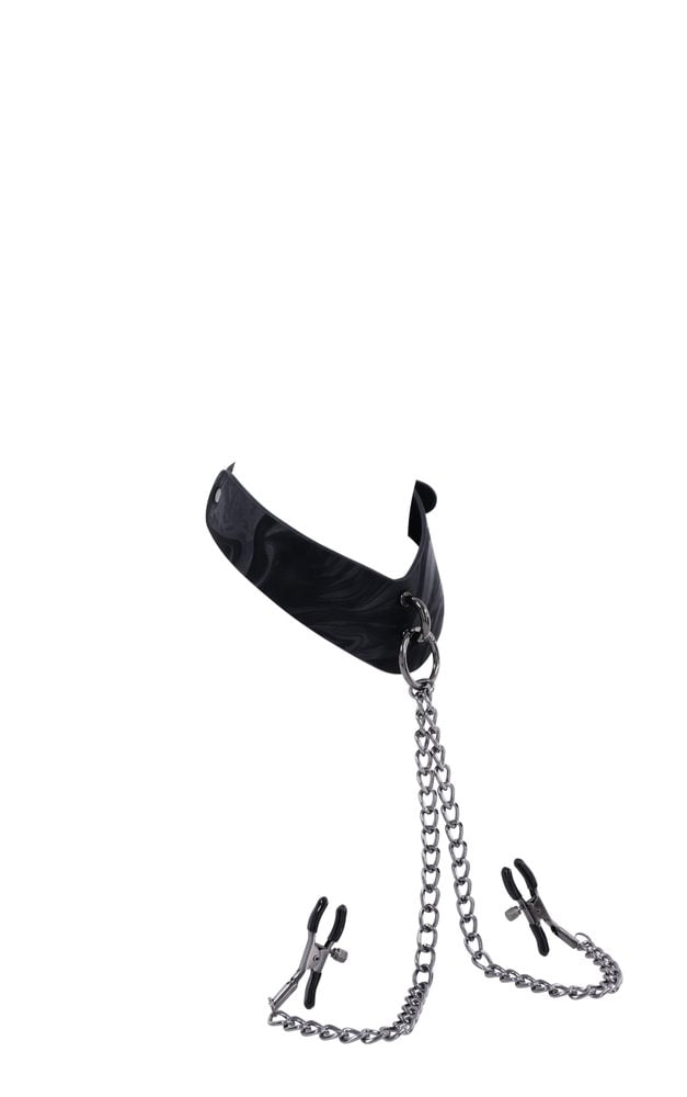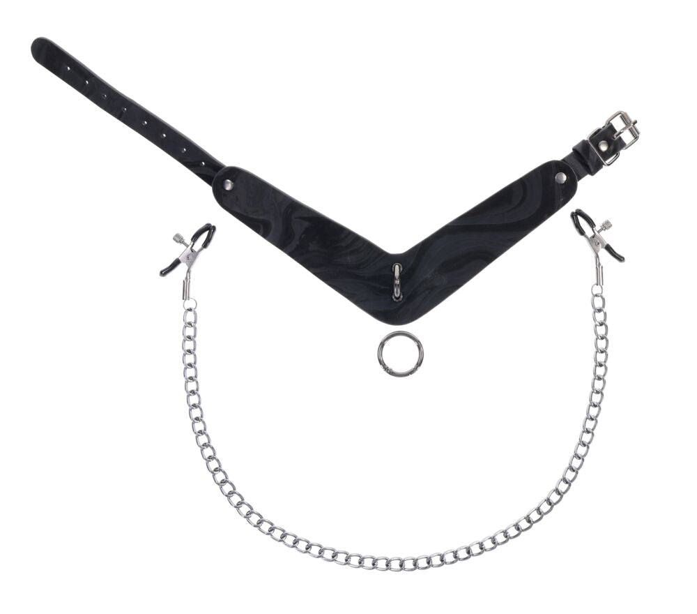 Transform any ordinary day into an adventure of control and subtle teasing. The removable 22-inch (56 cm) chain links to nipple clamps, which are fully adjustable to enhance comfort or intensity at your whim. Whether incorporated into a full bondage ensemble or used as a standalone statement piece, its versatility is unmatched. Remove the clamps and attach a leash or use it as a sophisticated day collar – the choices are boundless.