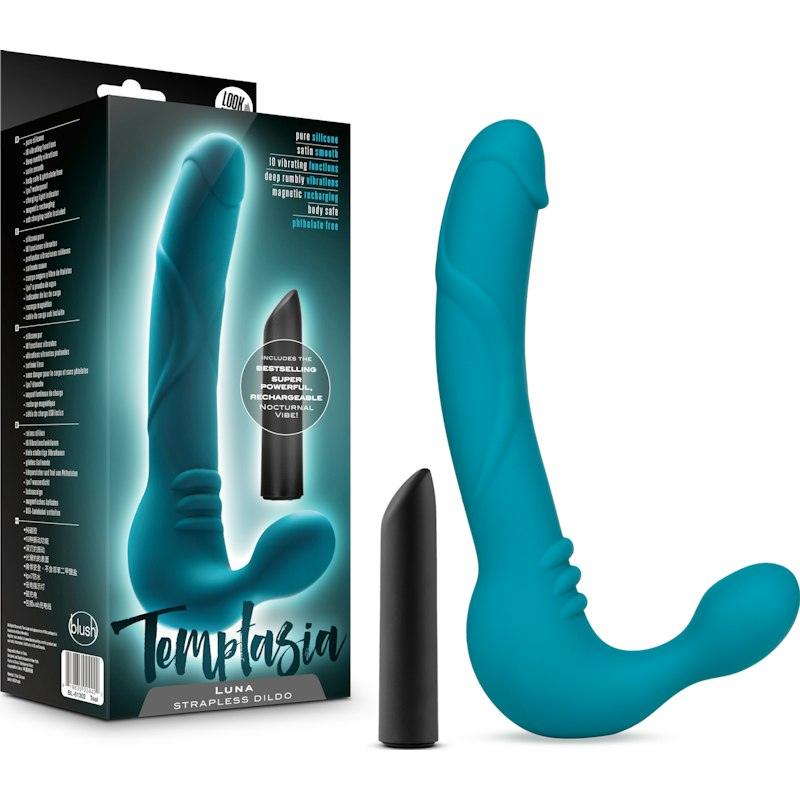 The Temptasia Luna Strapless Dildo with Vibrating Bullet brings pleasure for everyone! This elegantly curved toy features two ends-a delicately rounded bulb and a gently textured shaft. Insert the powerful 10-function bullet vibe into Temptasia Luna and enjoy its deep, rumbly vibrations along with your partner. The waterproof, rechargeable bullet vibe can also be used outside the dildo. Its slanted tip is ideal for intense focused stimulation. Made of satin smooth, platinum cured silicone, Luna is body safe and easy to clean.