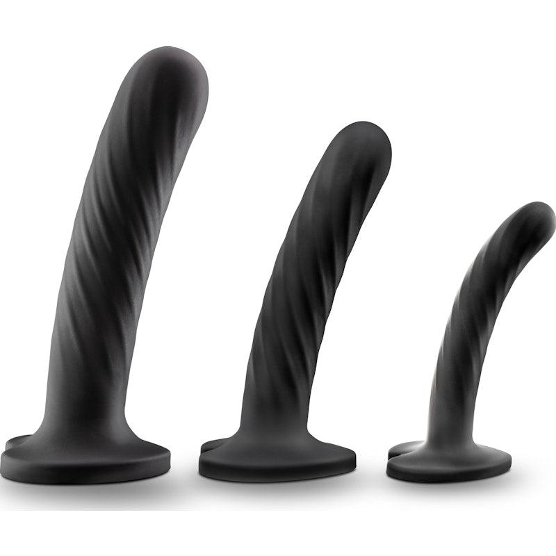 The Temptasia Twist Kit includes all three Temptasia Twist dildos, so you can find just the right size for any kind of play. The Twist dildos deliver swirling texture that's perfect for gentle G-spot or anal stimulation. Their cute heart-shaped bases have strong suction cups and are harness and strap on compatible. Either solo or with a partner, the Temptasia Twist Kit is a fun, stylish addition to your playtime. From the slim, petite Twist Small to the satisfyingly girthy Twist Large, this collection has something for everyone. With a satin smooth silicone finish, these dildos are made for comfort. Their 100% platinum cured silicone is body safe and easy to clean: just boil for 5 minutes to fully sanitize, or wash with mild soap and water during everyday use.