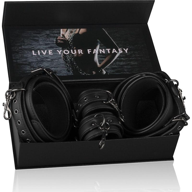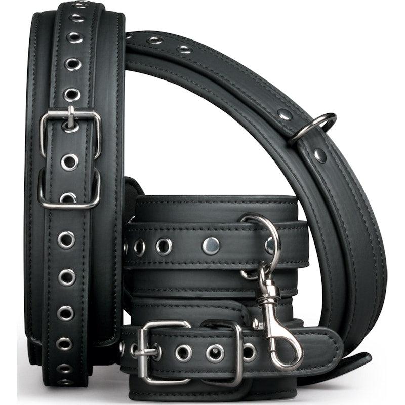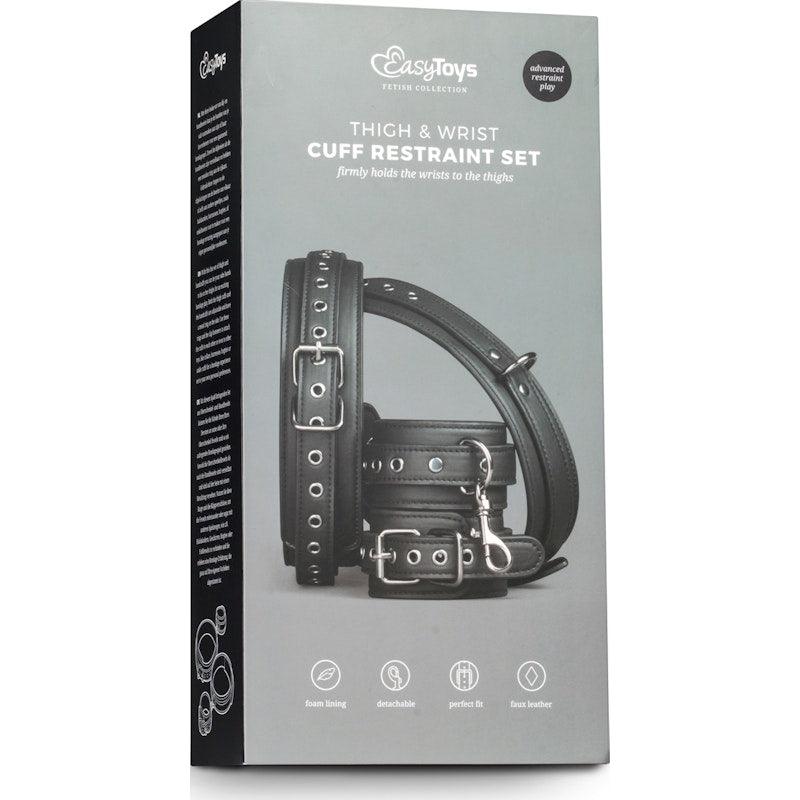 With this special thigh and wrist cuff set, you can tie your sub's hands to his or her thighs.