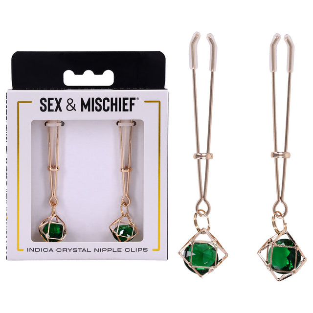 Sex And Mischief Indica Crystal Nipple Clips Gold With Emerald Gems fuses daring real-world sensation with luxe visual appeal. Two gold-tone clips cradle the nipples in a secure, comfortable grip, while emerald gem accents catch the light and add a striking, jewelry-like allure to intimate moments. This is luxury BDSM gear that looks as stunning as it feels.