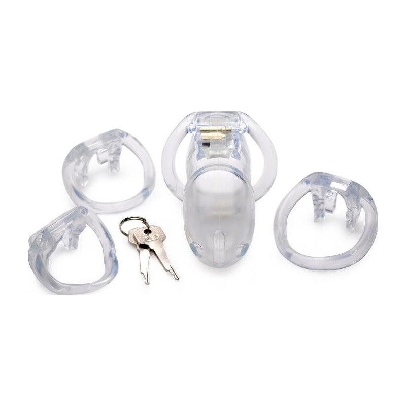 The cage's see-through material not only maintains the element of control by keeping the wearer's state visible but also simplifies maintenance, making it easier to clean and manage.