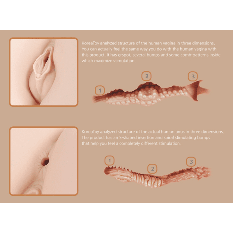 Real Hip Hera 1:1 features two enticing entries — vaginal and anal. Each path is crafted with unique internal textures providing distinct sensations. The vaginal path is designed with a thick G-spot enhancing the feel of depth and tightness, while the anal pathway offers strong compression and absorption, providing a different yet equally thrilling experience.