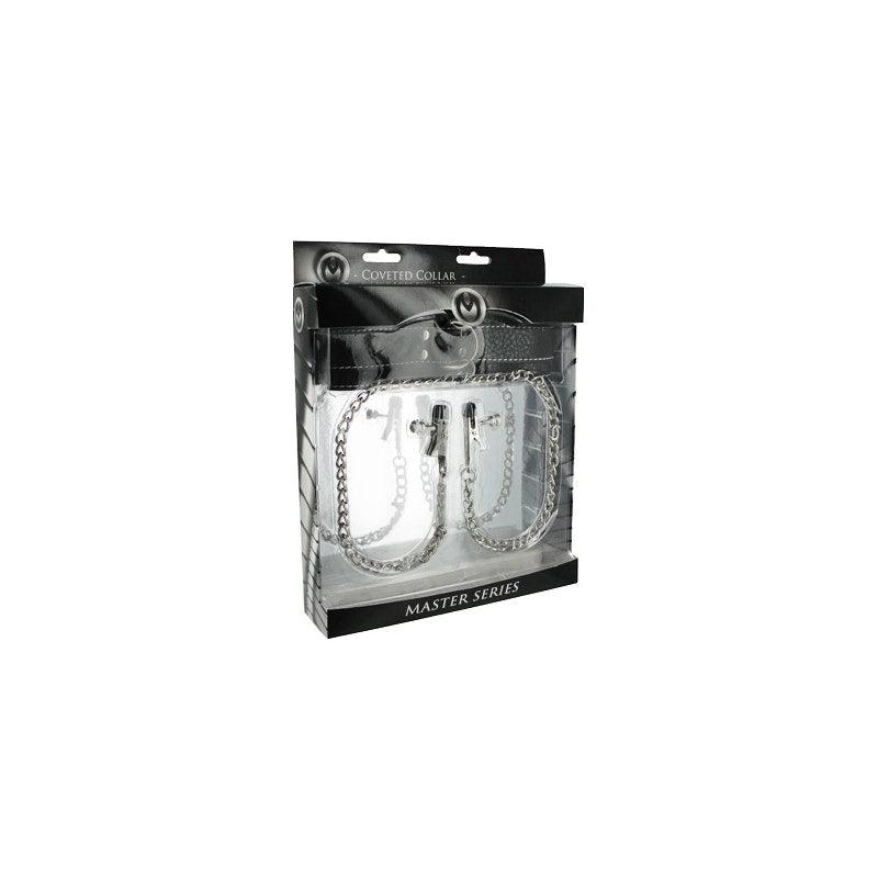 Imagine the seductive combination of leather and metal, collar and clamp...pleasure and pain. Master Series has your fix with the Coveted Collar and Clamp Union. This two in one set is made with submission in mind. The quality leather collar secures by means of a buckle and has two 12 inch chains attached to a front D-ring. Ending the chains are adjustable nipple clamps that are quickly and easily made tighter or more loose with thumb screws, so you can decide just how much punishment your naughty one requires.