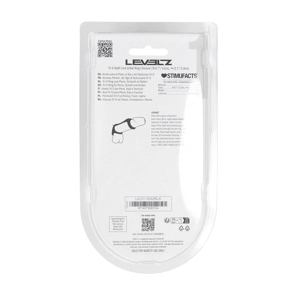 Levelz Tri O Silicone Shaft Cock and Ball Ring in bold Black delivers a premium, comfortable experience designed to enhance sensation and performance. The innovative Tri O design provides balanced pressure around the shaft and testicles, promoting firmer erections and longer session endurance while maintaining a secure, comfortable fit.